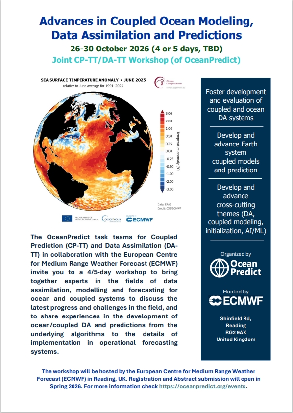 The OceanPredict task teams on Coupled Predictions (CP-TT) and Data Assimilation (DA-TT) are organizing a joint workshop at ECMWF, UK on “Advances in coupled modeling, data assimilation, and predictions” in the week commencing 26 Oct 2026.